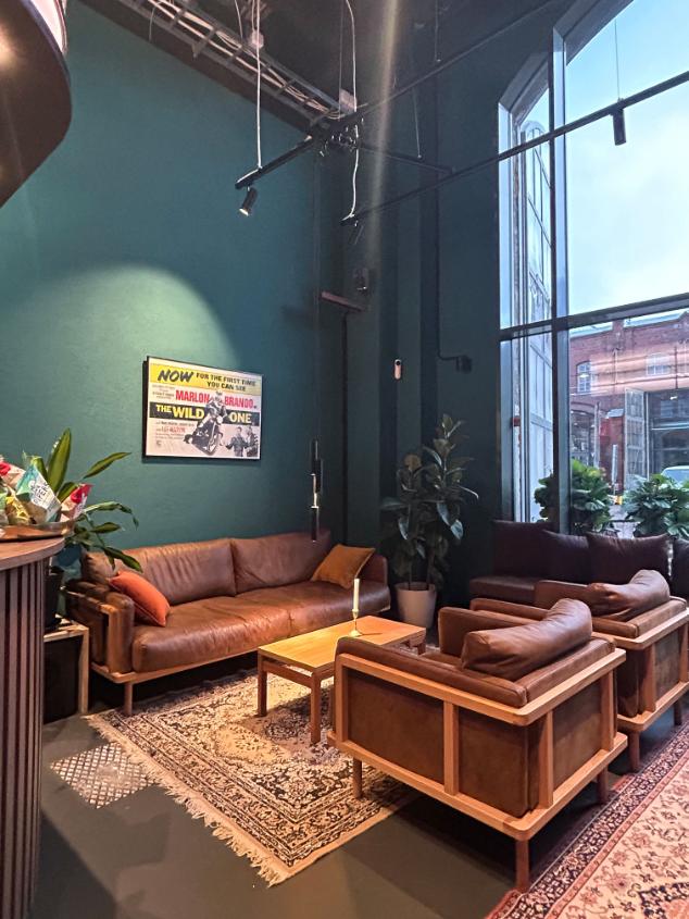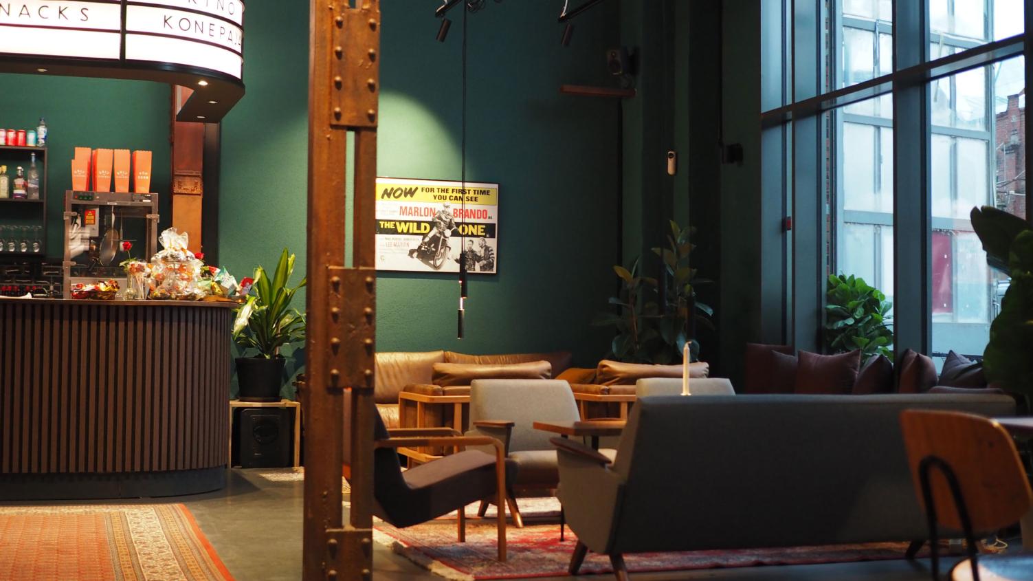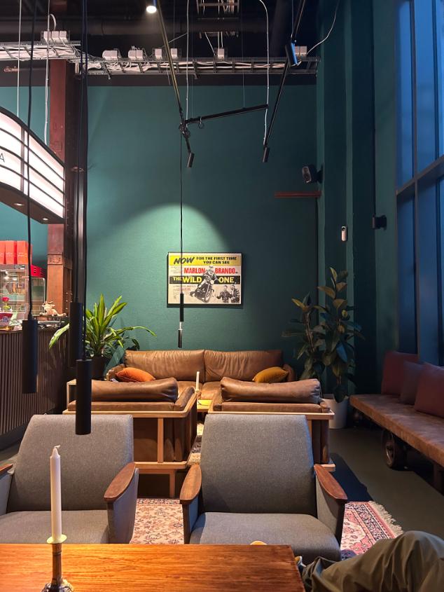 As it is an independent cinema we created a unique space that has a strong recognisable atmosphere. Its distinct industrial ambience was achieved by using dark tones, warm lighting and exposing the old steel pillar and beam structures. A bespoke lit cinema marquee above the bar counter is a nod to early cinemas. A timeless space that feels like the cinema has always been there. A space for movie lovers to enjoy the films on comfy sofas with high-end visuals and sound, and a bar that invites to hang out both before and after the movie.